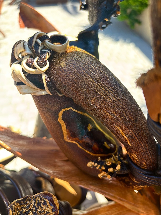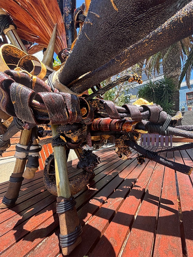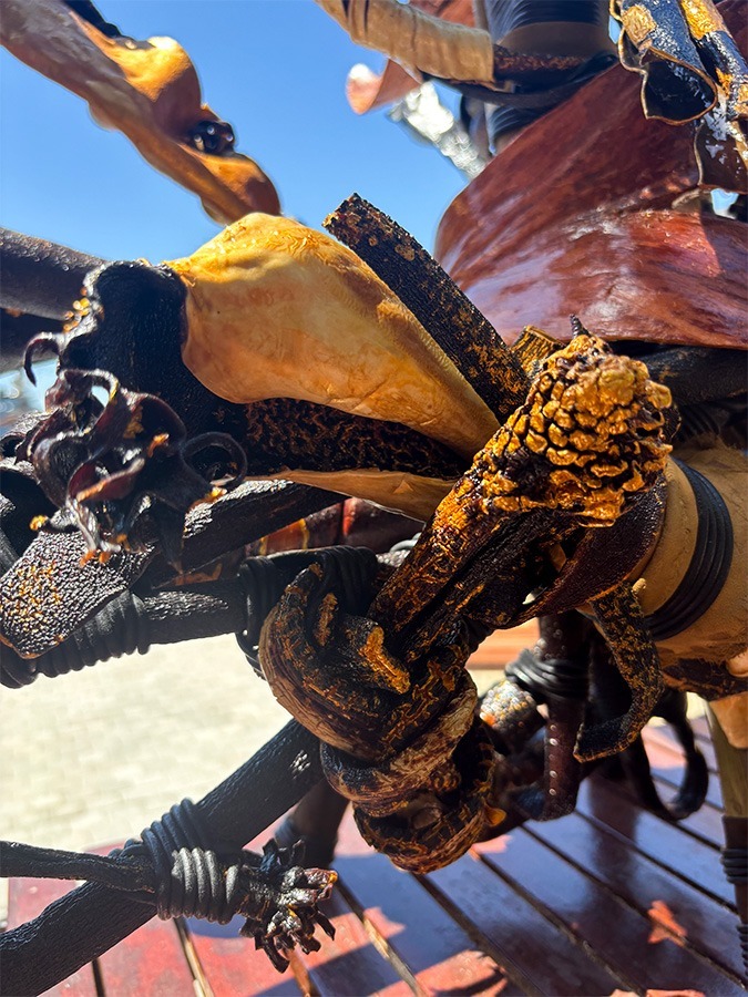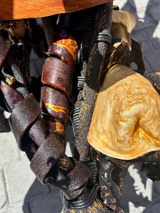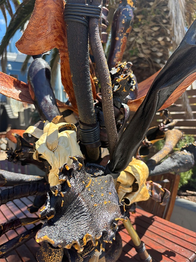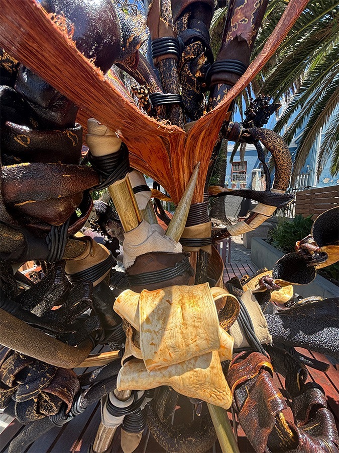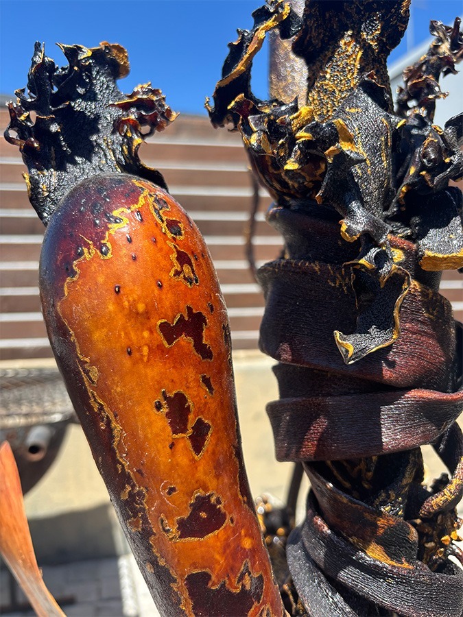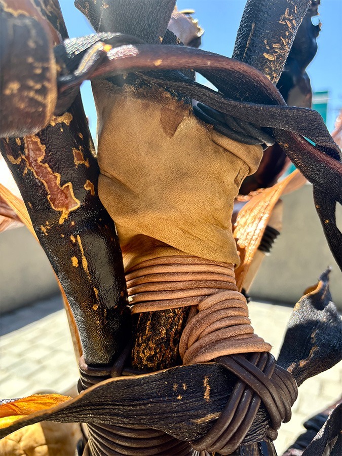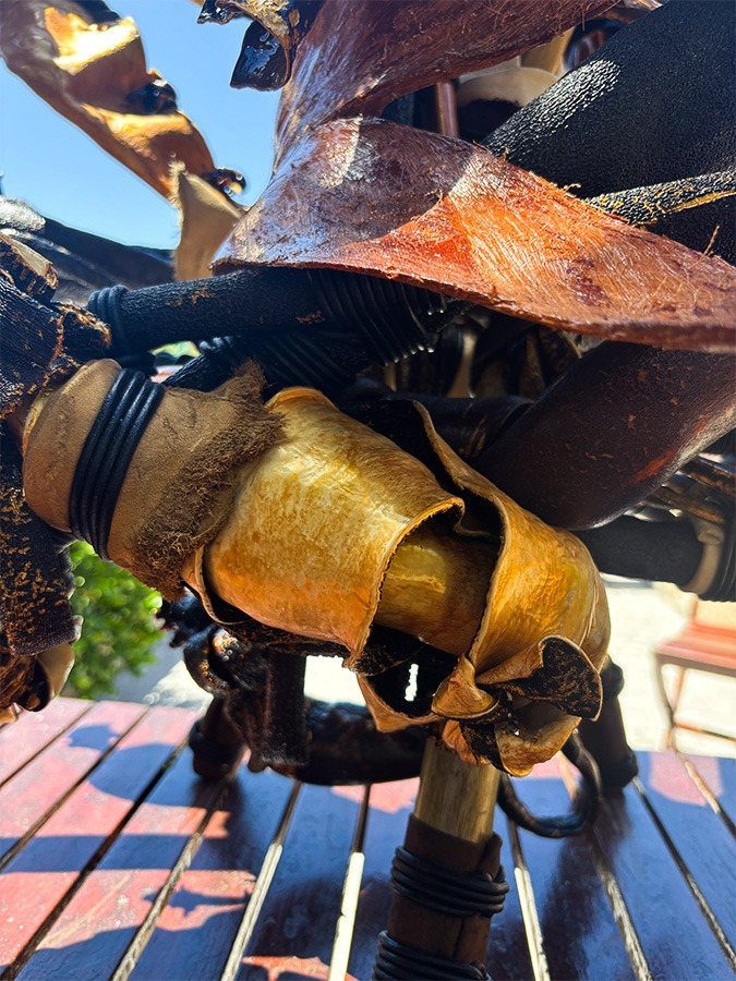 Used material: Dried bull kelp, palm leaf bases, leather, wood, varnish, gold paint, small quantities of wood filler