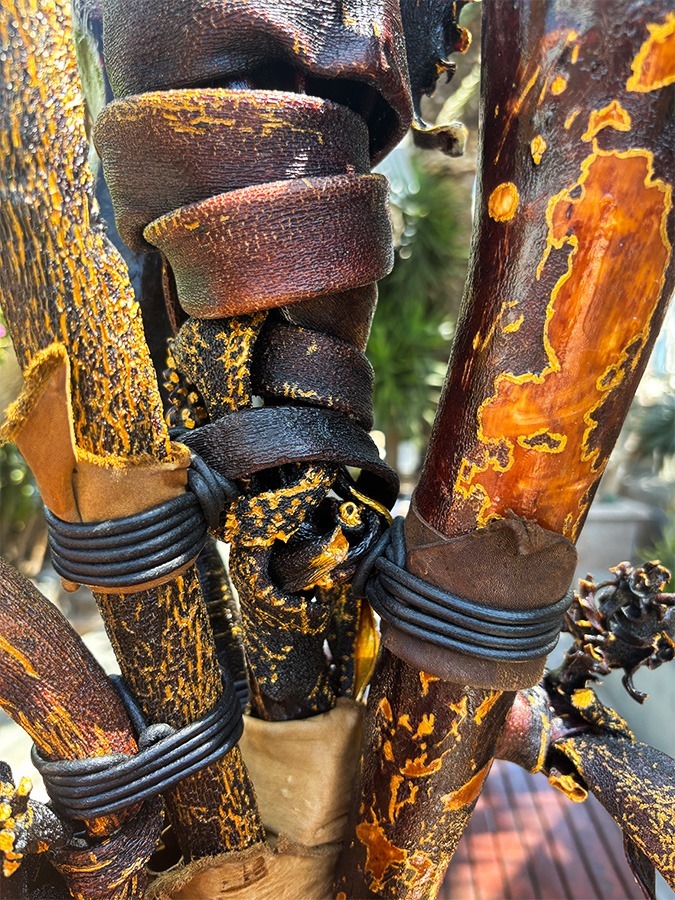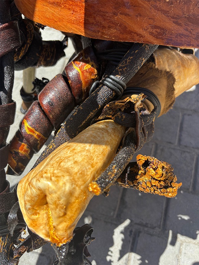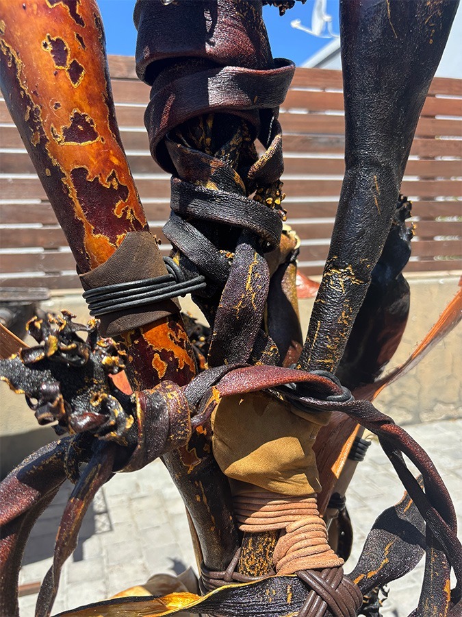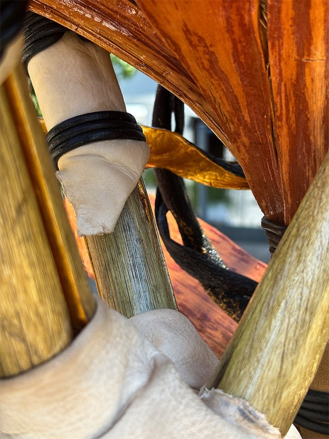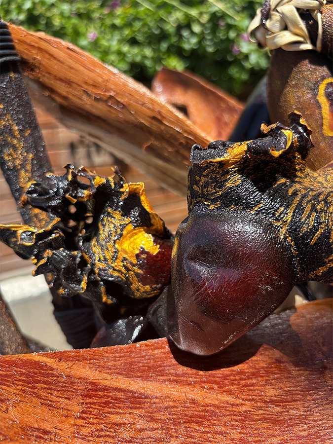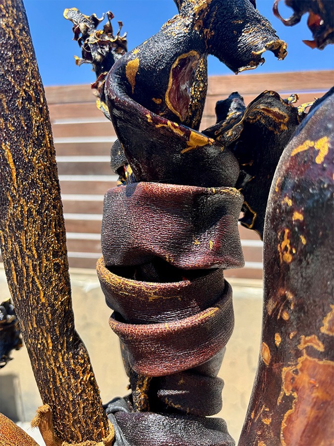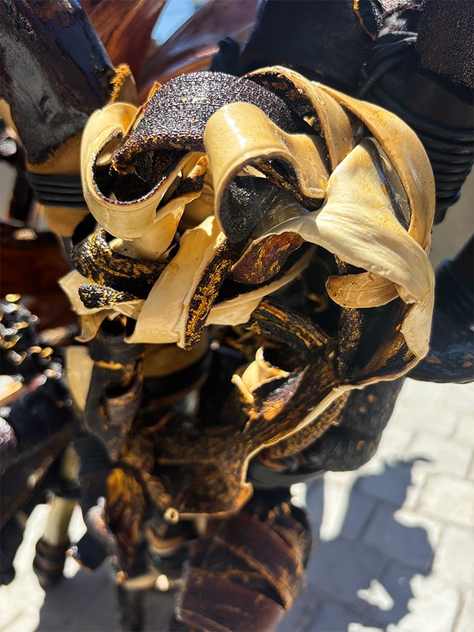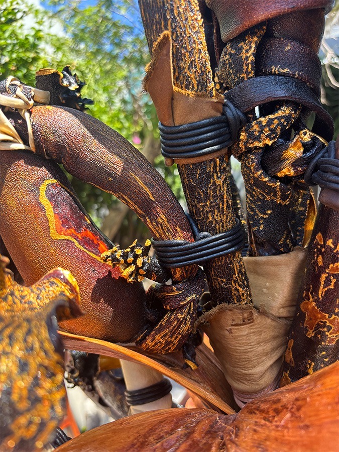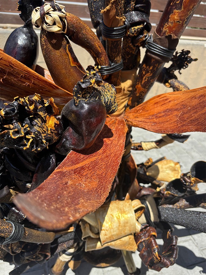 Used material: Dried bull kelp, palm leaf bases, leather, wood, varnish, gold paint, small quantities of wood filler