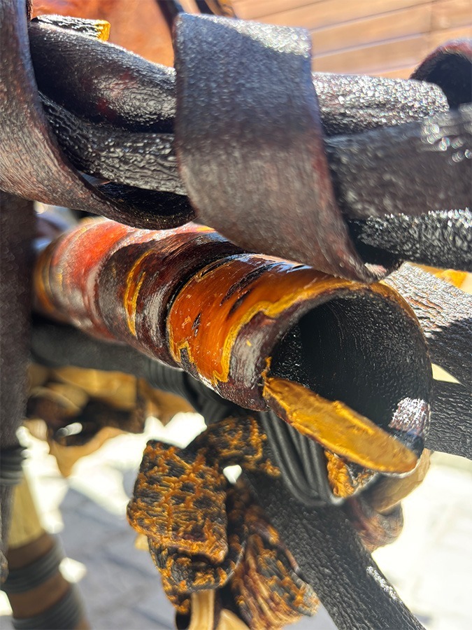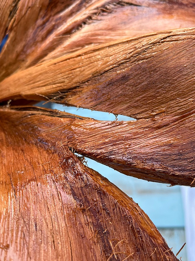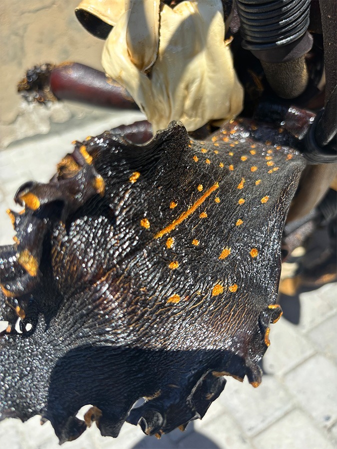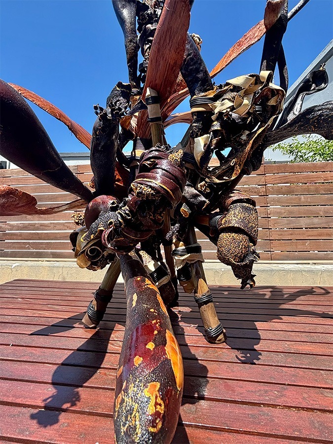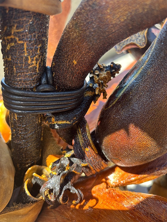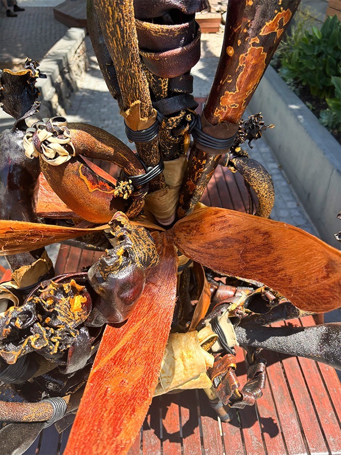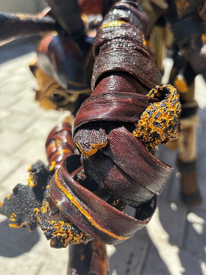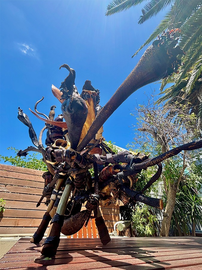 Used material: Dried bull kelp, palm leaf bases, leather, wood, varnish, gold paint, small quantities of wood filler
