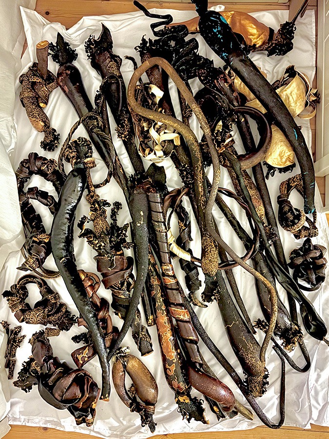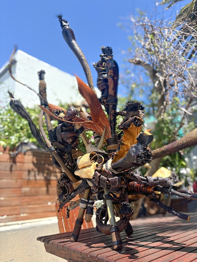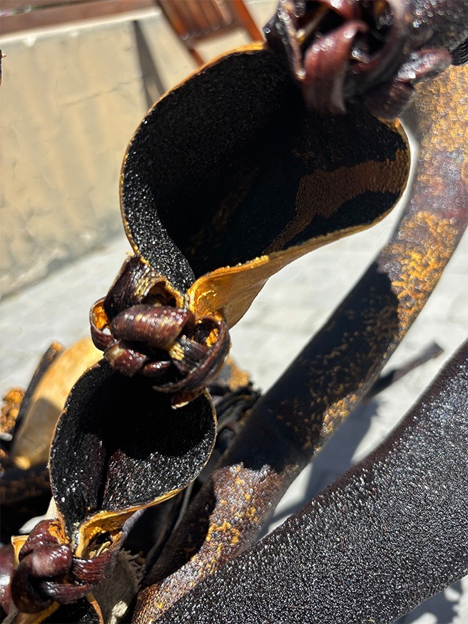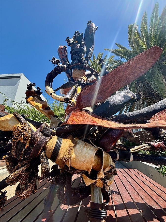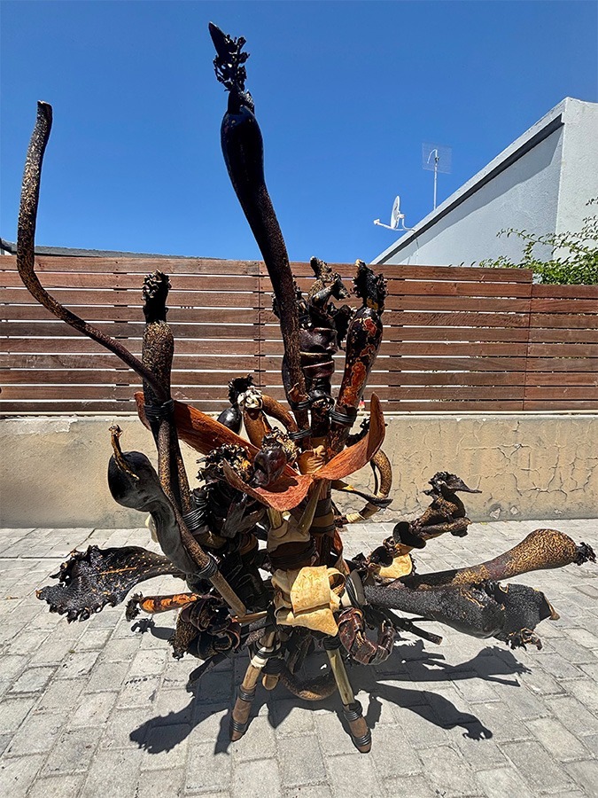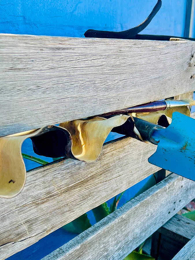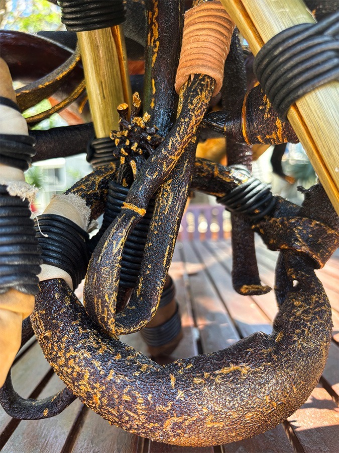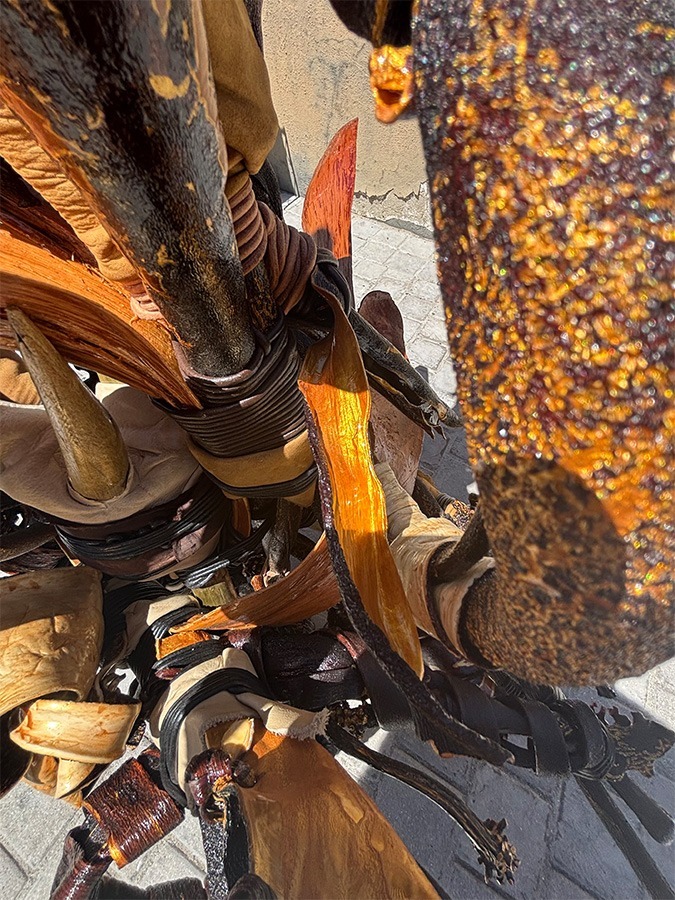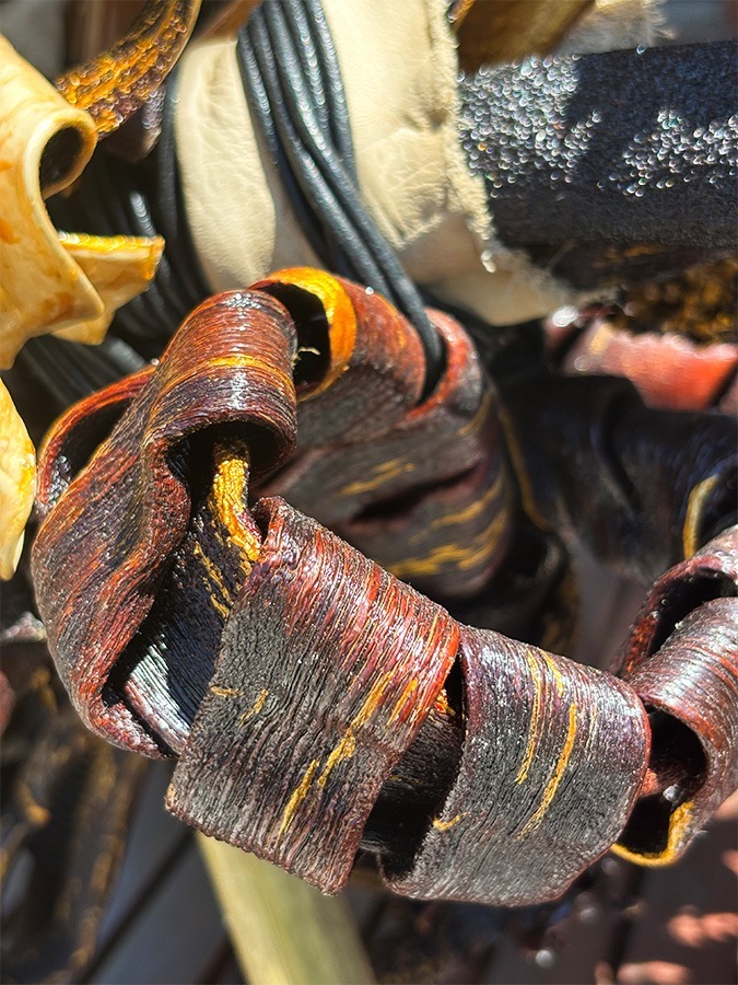 Used material: Dried bull kelp, palm leaf bases, leather, wood, varnish, gold paint, small quantities of wood filler