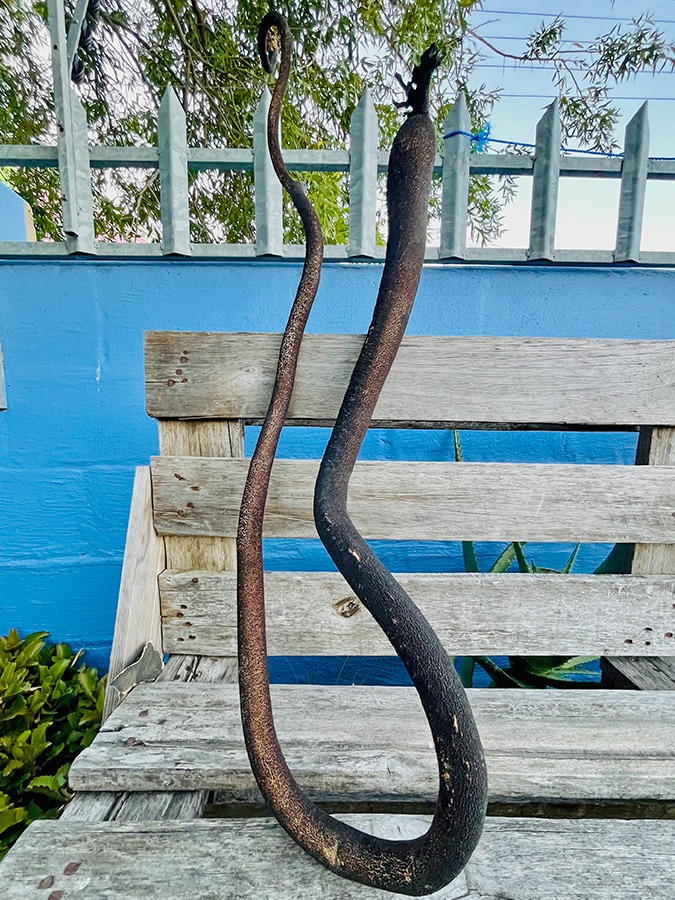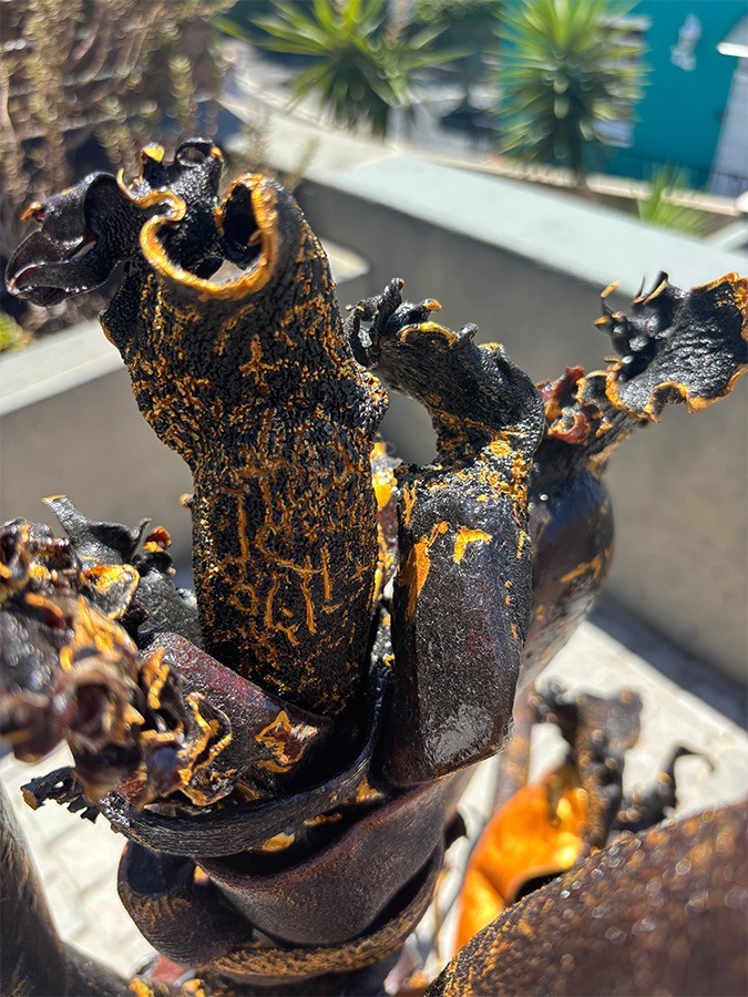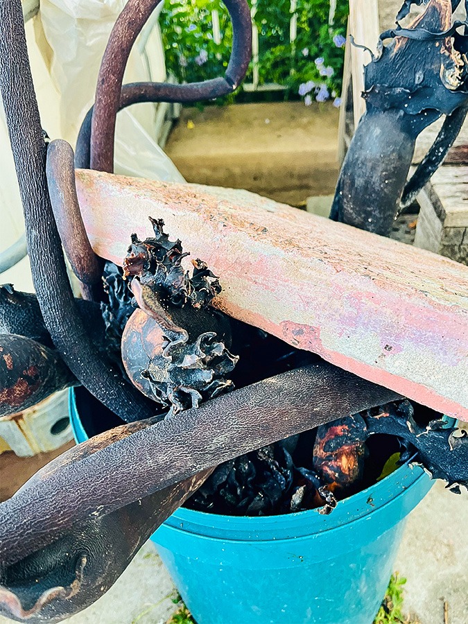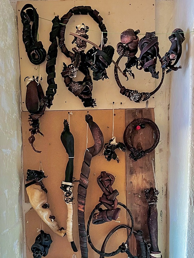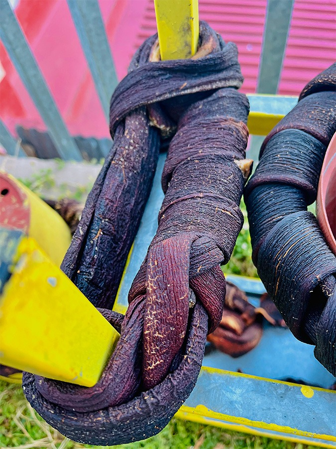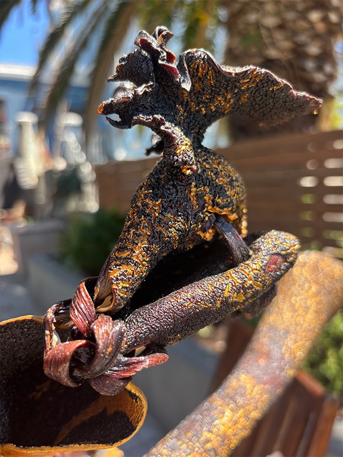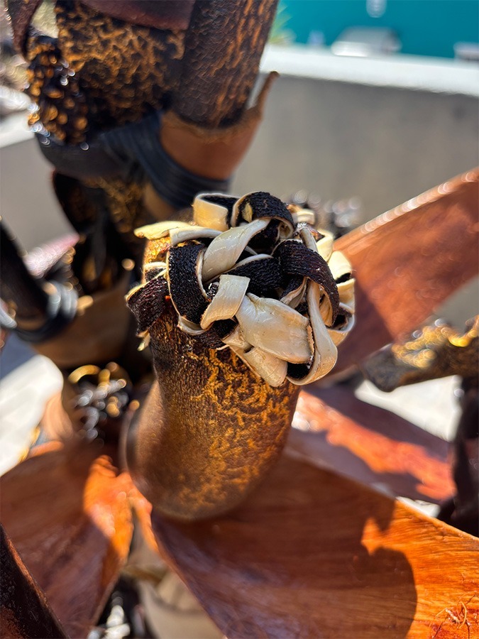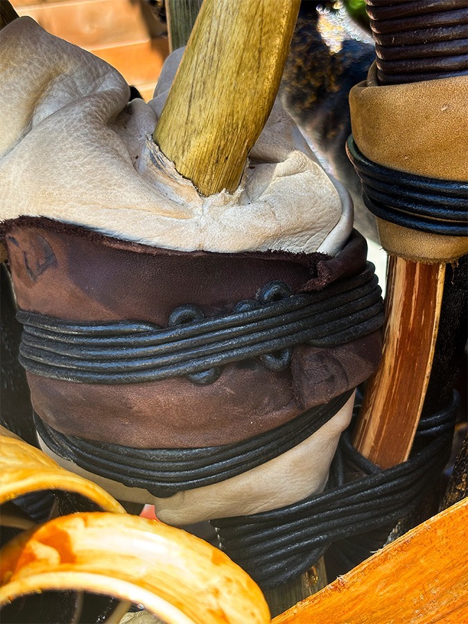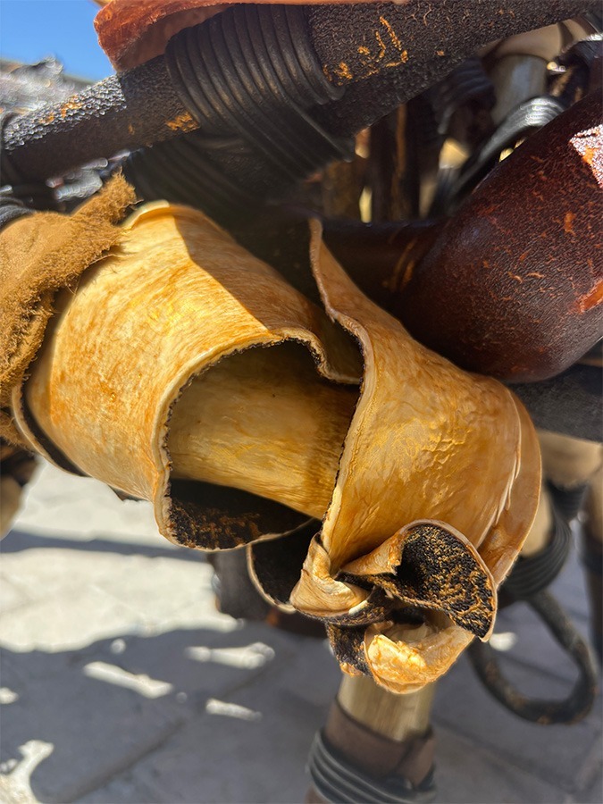 Used material: Dried bull kelp, palm leaf bases, leather, wood, varnish, gold paint, small quantities of wood filler