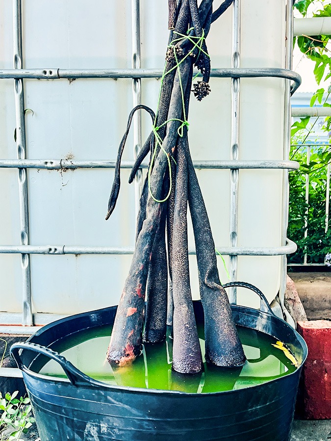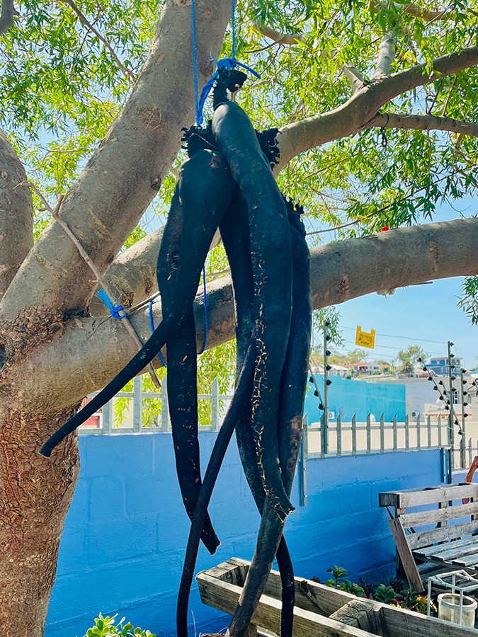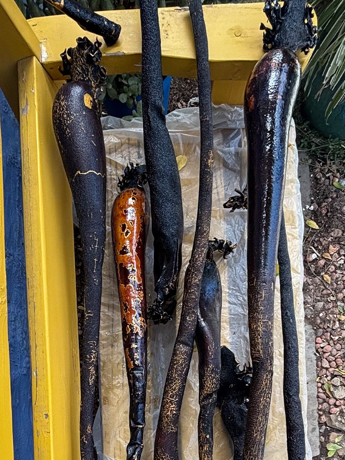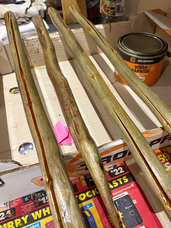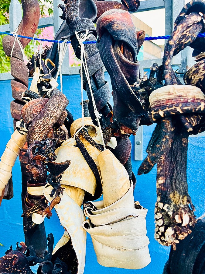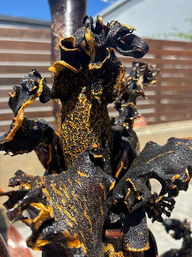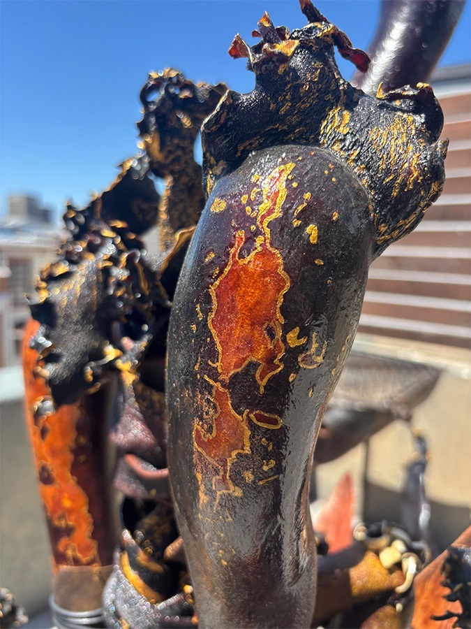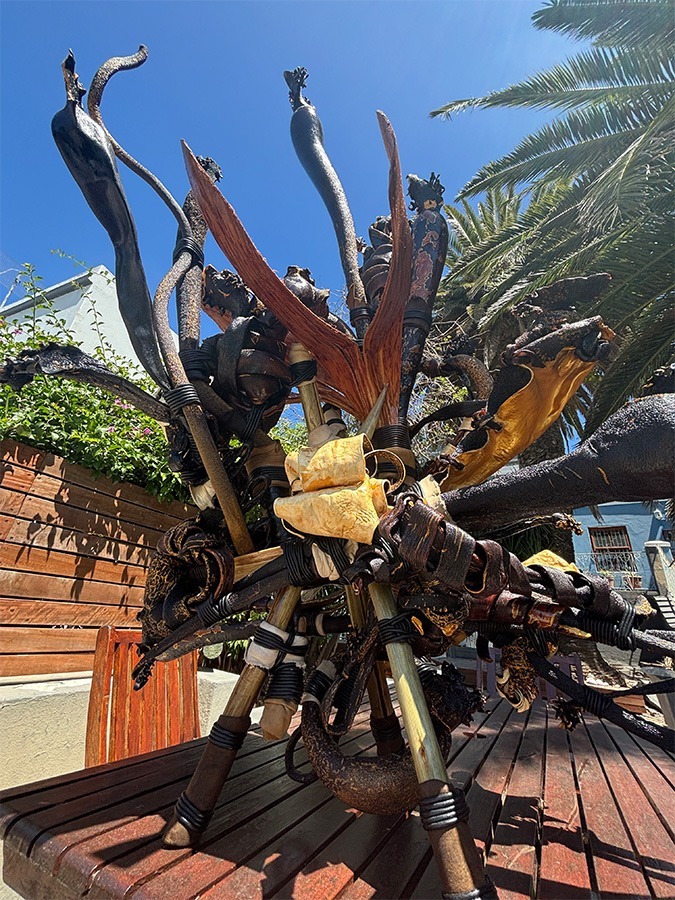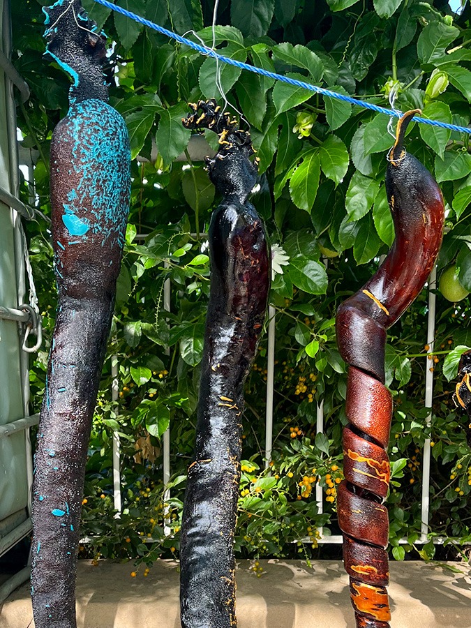 Used material: Dried bull kelp, palm leaf bases, leather, wood, varnish, gold paint, small quantities of wood filler