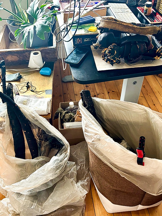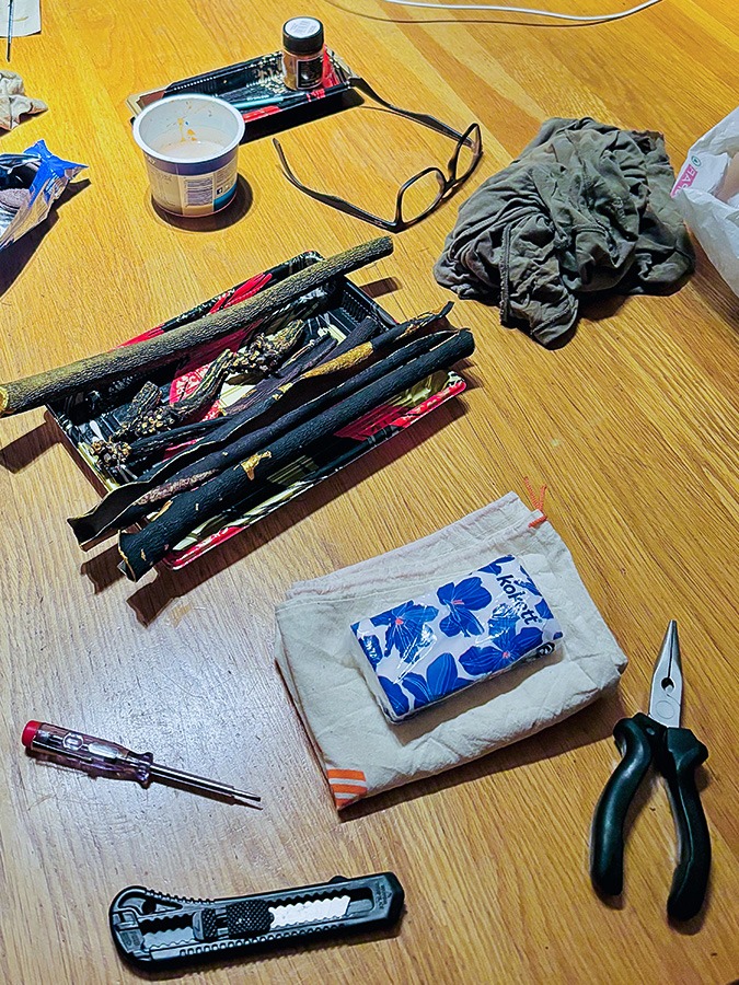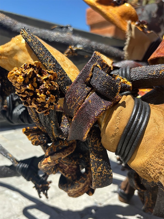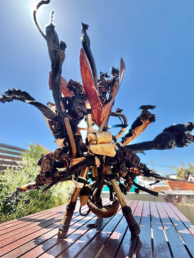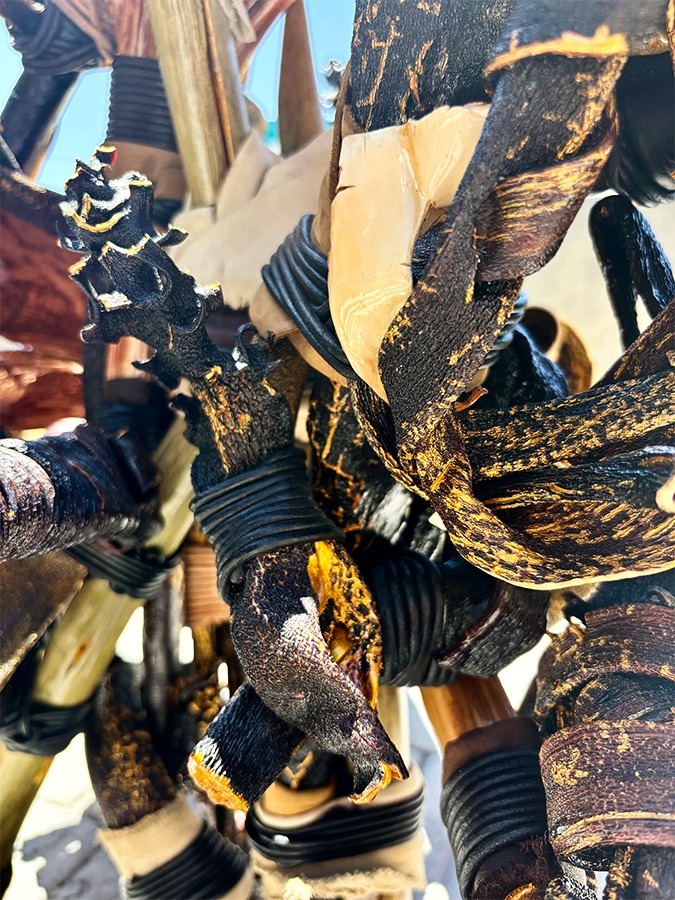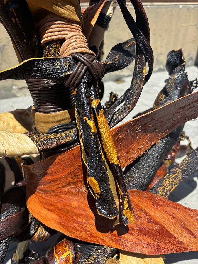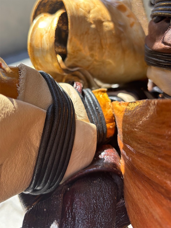‘Tide Cluster’ does not imitate these natural accumulations but reconfigures them into a deliberate sculptural composition. The individual elements are connected exclusively by leather, without screws, nails or adhesive, allowing tension and balance to emerge from the material itself.