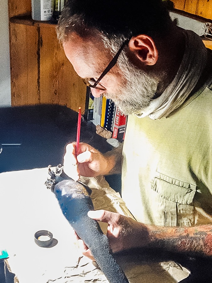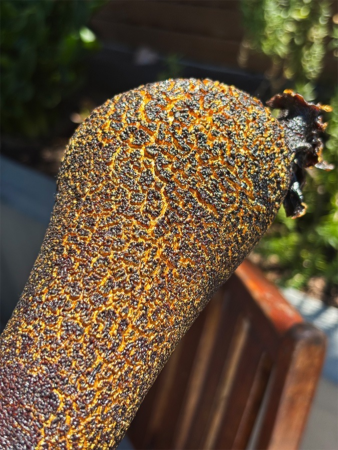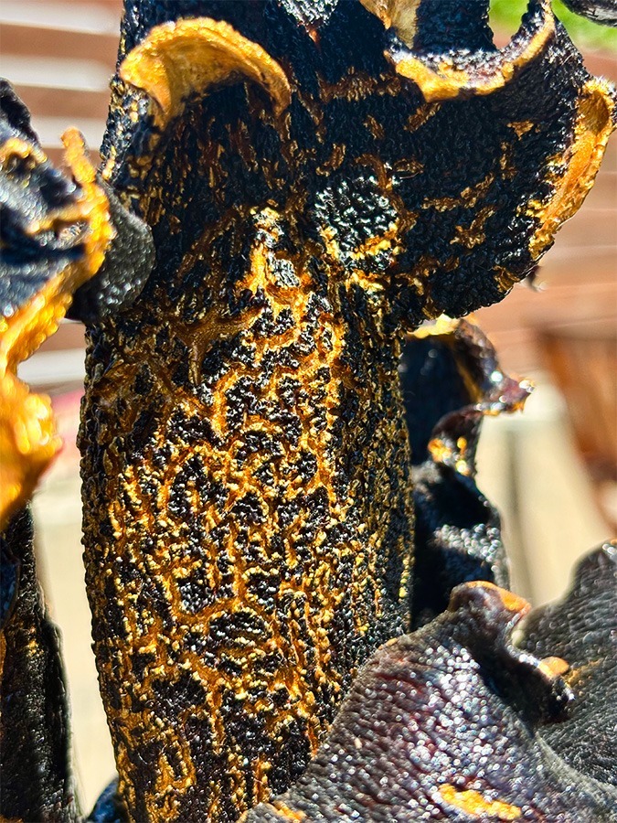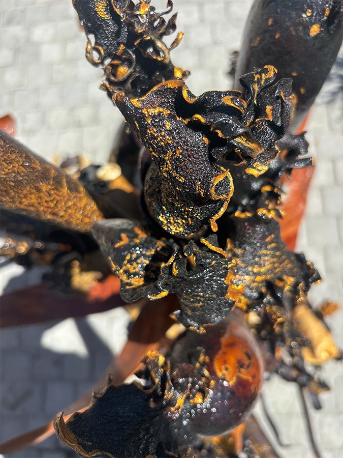 Natural crack structures are partially accentuated with gold, shifting the perception of what is often regarded as marine debris into something precious. The work moves between ecological reality and aesthetic reinterpretation, forming a dynamic 360-degree object that changes character depending on viewpoint and light.